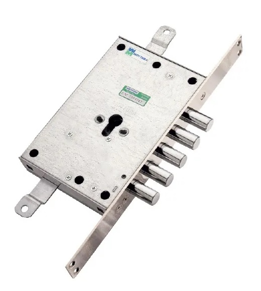 Замок врезной цилиндровый, без защёлки, с тягами. Для установки в металлические двери.Без лицевой планки, бэксет 63 мм, пять ригелей диаметром 18 мм с вылетом 29 мм. Расстояние между осями ригелей 28 мм. Цилиндр крепится с помощью винта и крепёжной пластины.С защитой цилиндра от извлечения.